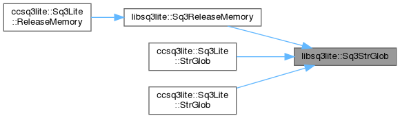 The Sq3StrGlob (P,X) interface returns zero if and only if string X matches the GLOB pattern P. The definition of GLOB pattern matching used in Sq3StrGlob (P,X) is the same as for the "X GLOB P" operator in the SQL dialect understood by SQLite. The Sq3StrGlob (P,X) function is case sensitive.